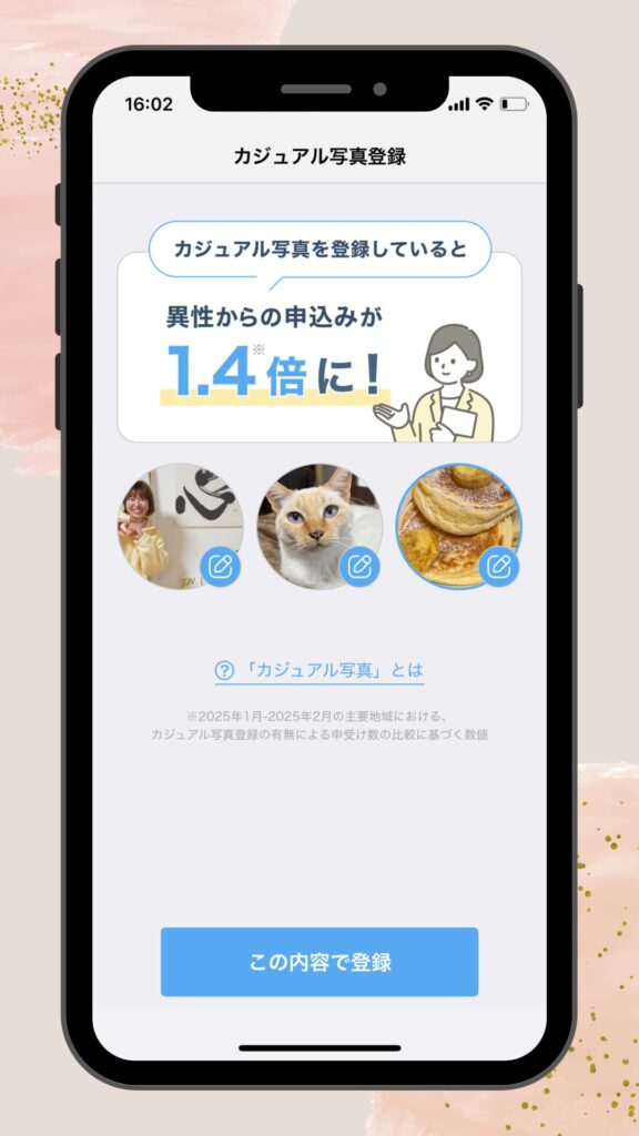 登録写真の多い方ほど、お見合い申込みをもらいやすくなりますので(なんと1.4倍!)、必ず登録しましょう👌💕