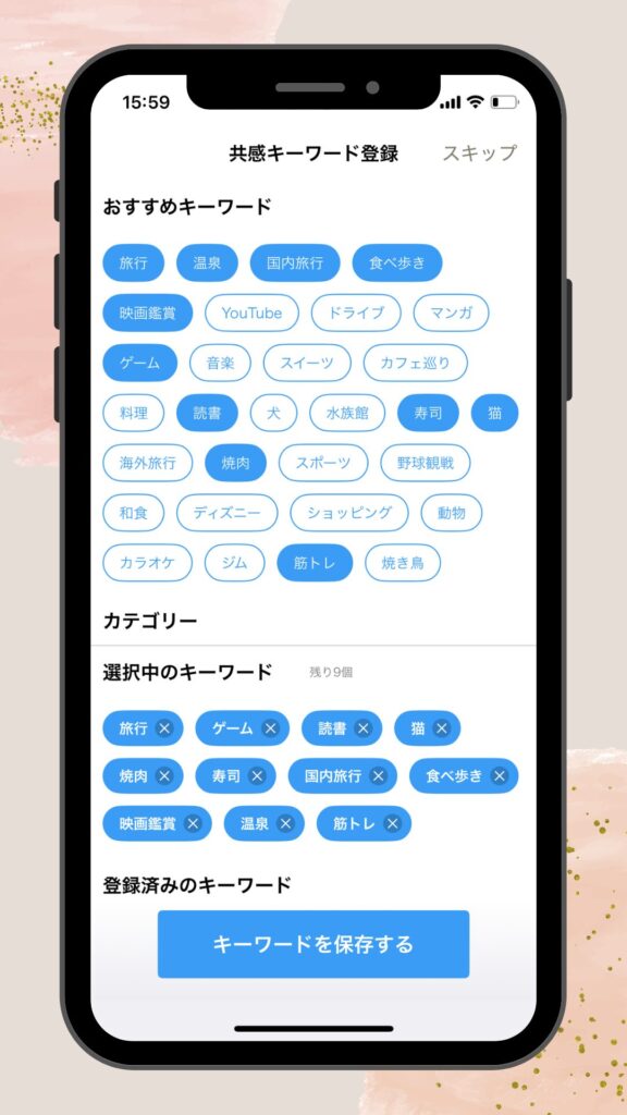 自分が興味のあることを共感キーワードで登録しておくことで、同じキーワードを登録している方と出会いやすくなります。